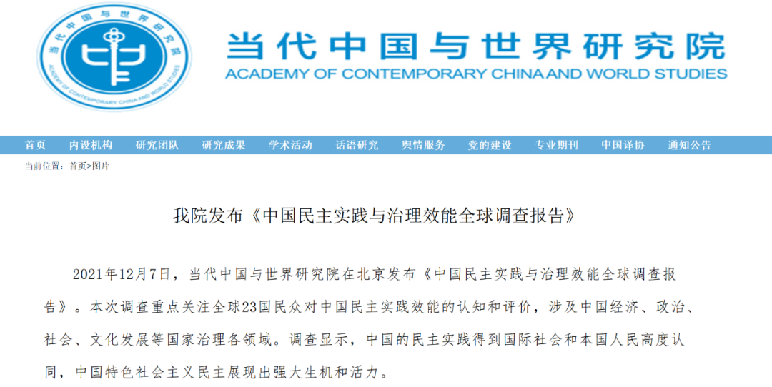 2021年12月7日,当代中国与世界研究院在北京发布《中国民主实践与治理效能全球调查报告》。