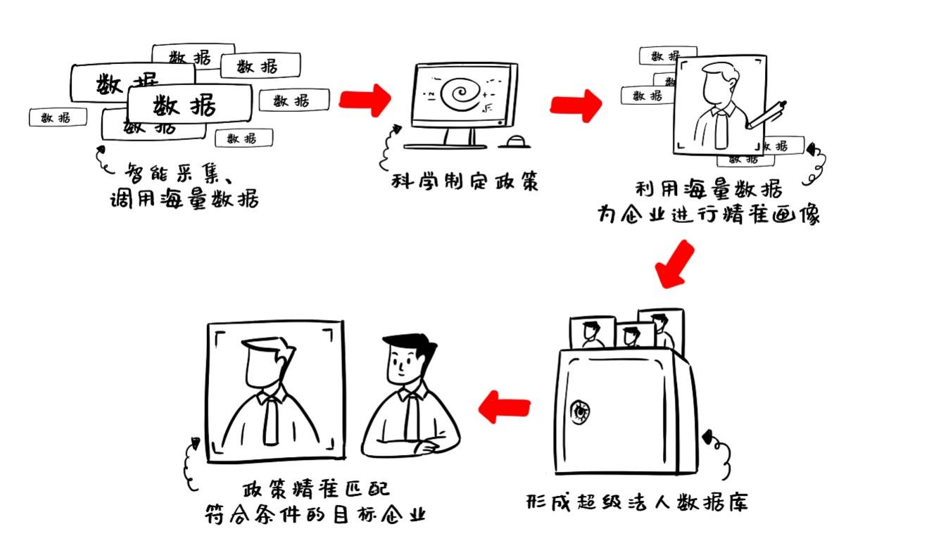 绘制企业精准画像的前提是打通各个政府部门间的信息壁垒,融合各类数据信息,形成庞大的超级法人数据库。在政策推送环节引入大数据及算法技术后,各部门间小小的“抽屉格”纷纷被打通,跨部门海量数据均整合至“大仓库平台”以便统一管理。