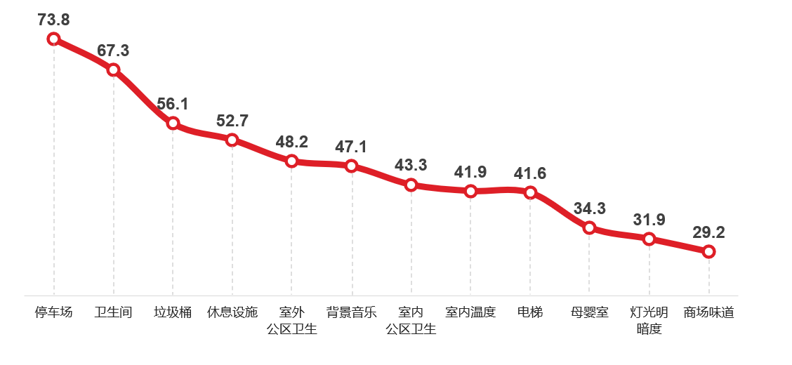 附图:消费者在购物中心内部对硬件设施的体验关注度排序