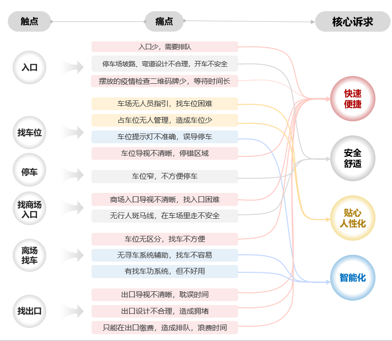 通过研究消费者在购物中心停车场的体验流程和心情曲线,梳理消费者在每一个触点所遇到的痛点,我们整理洞察出消费者对停车场的四大核心诉求,分别是(1)快速便捷;(2)安全舒适;(3)贴心、人性化;(4)智能化。