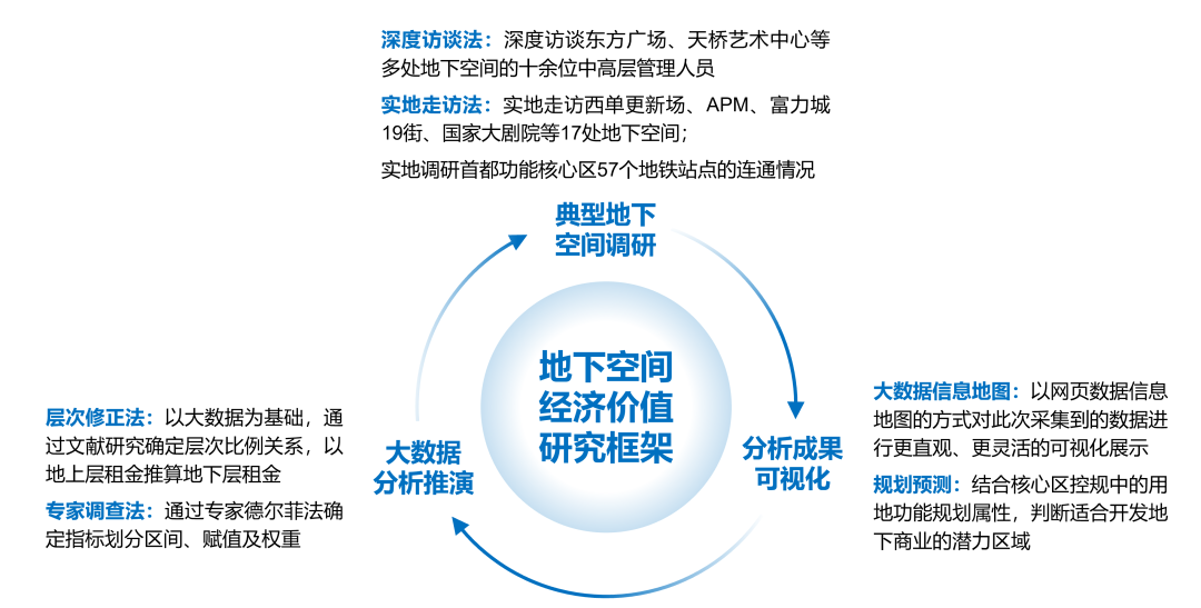 本次研究采取线上与线下、定量与定性相结合的研究方法,通过典型地下空间调研、大数据收集与量化模型推演、规划因素校核与空间可视化等方法,梳理地下空间现状利用特征,开展地下空间经济价值评估,明确地下空间经济价值与开发潜力较高的区域,剖析地下空间更新改造需求及实施难点,以期有效指导城市地下空间资源的高效配置。