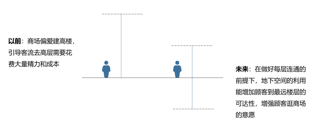 正如访谈过程中某商场工程改造部相关人员所提出的,地下空间的开发利用和存量更新在未来一定是大趋势,地下空间具有很高的经济价值。以往的商场偏爱建高楼,引导客流去高层需要花费大量精力和成本。但未来可以把地下空间利用起来,在做好每层连通的前提下,地下空间的利用能增加顾客到最远楼层的可达性,增强顾客逐层逛商场的意愿,增大顾客消费的可能,从而提升项目整体的空间利用效率和经济效益。
