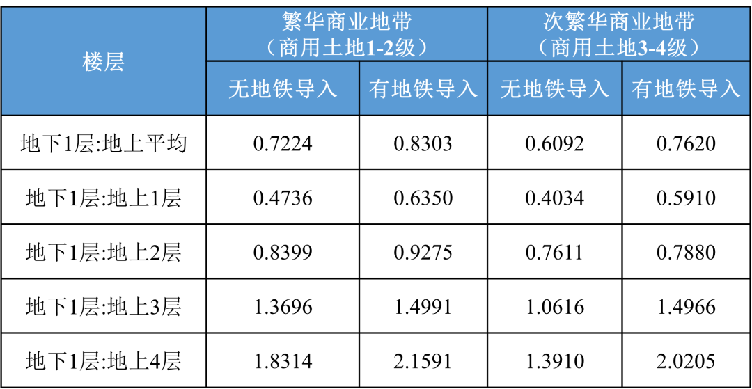 本次地下空间经济价值评估主要针对商业开发类及商务办公类地下空间。地下空间经济价值评估相对于传统的土地经济价值评估,需要考虑竖向高度/深度及楼层分布带来的经济价值影响,目前比较常见的方法包括楼层效用比1和基准地价系数修正法2。同一区位、同一用途但竖向层次不同的建筑空间,其经济价值在不同竖向层次之间存在一定的比例关系,利用这一比例关系,即可在已知某竖向层次建筑空间经济价值的情况下进行其它竖向层次的价值推导。