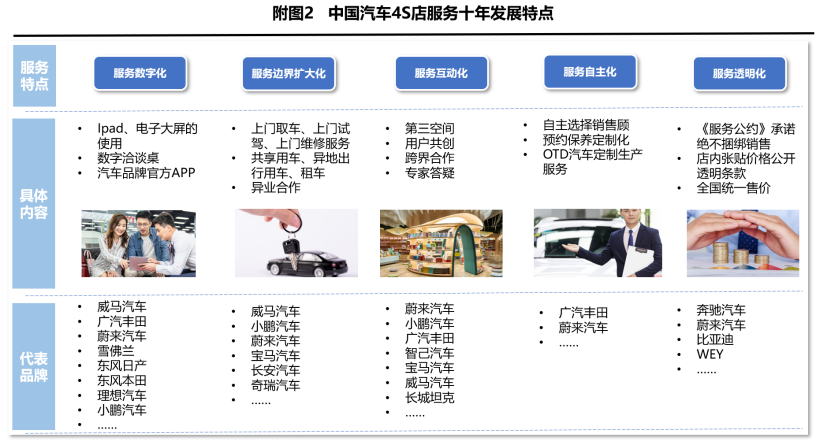 中国汽车4S店服务从原本的“4S”服务新增了金融服务、共享服务、二手车服务、智慧体验、互动社区等服务,向“NS”转型,突破传统物理边界、服务边界和业务边界,从1.0时代向2.0~3.0时代跃进,为用户提供更加数字化、扩大化、互动化、自主化和透明化的服务。